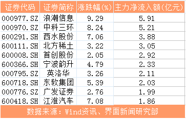 人工智能板块午后拉升,龙头概念股浪潮信息(000977.SZ)盘中涨停,但收盘前夕被砸开,主力净流入5.91亿元。有色金属板块个股出现分化,叠加稀土永磁概念的多只个股获得主力偏好,中科三环(000970.SZ)、北方稀土(600111.SH)、宁波韵升(600366.SH)、英洛华(000795.SZ)主力净流入额分别为5.21亿元、3.05亿元、2.33亿元、2.11亿元。此外,保险股西水股份(600291.SH)和券商股广发证券(000776.SZ)表现突出,分别实现主力净流入3.88亿元、1.99亿元,在新能源汽车概念带动下,江淮汽车(600418.SH)股价大幅上涨,主力净流入1.86亿元。