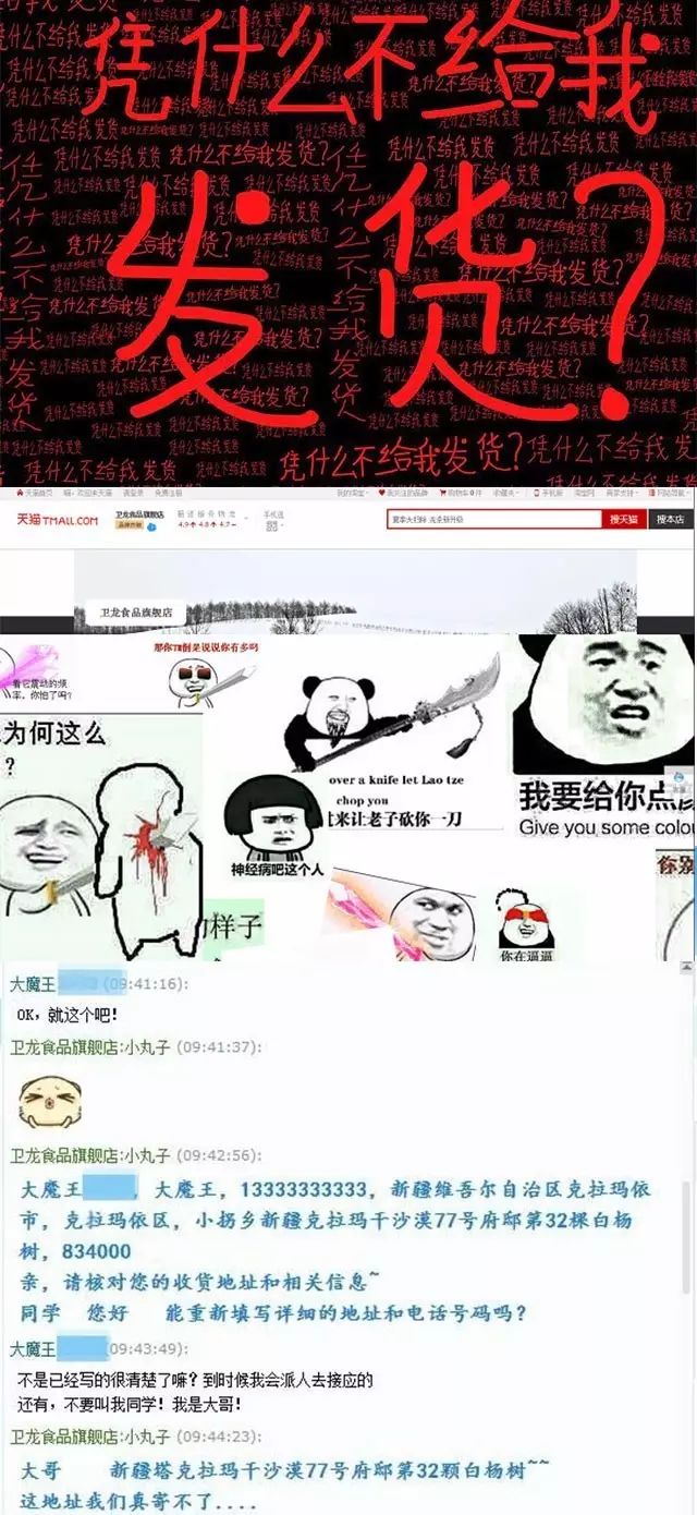 2016年6月8日,卫龙天猫旗舰店被黑。网上爆出旺旺聊天的截图,显示收货人的地址是新疆沙漠第32棵白杨树。买家是一个程序员,因为卖家没有发货,于是黑了店铺。