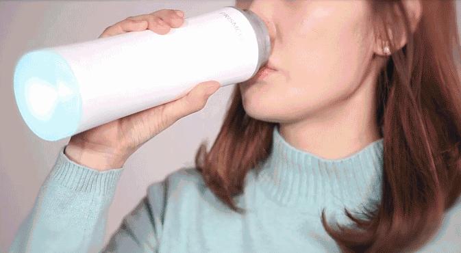 杯底有 LED 灯,当你需要喝水时,它会变蓝绿色;在识别饮料时,变白色;健康需要关注时,变成红色。