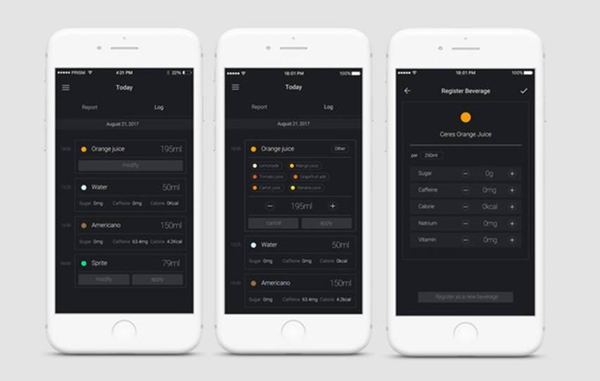 而神奇的水杯 PRISMCUPS ,能识别喝的是什么饮料,里面装的是什么成分、卡路里消耗等……还拥有提醒你喝水等各种健康功能,实在是追求健康人士的福音。