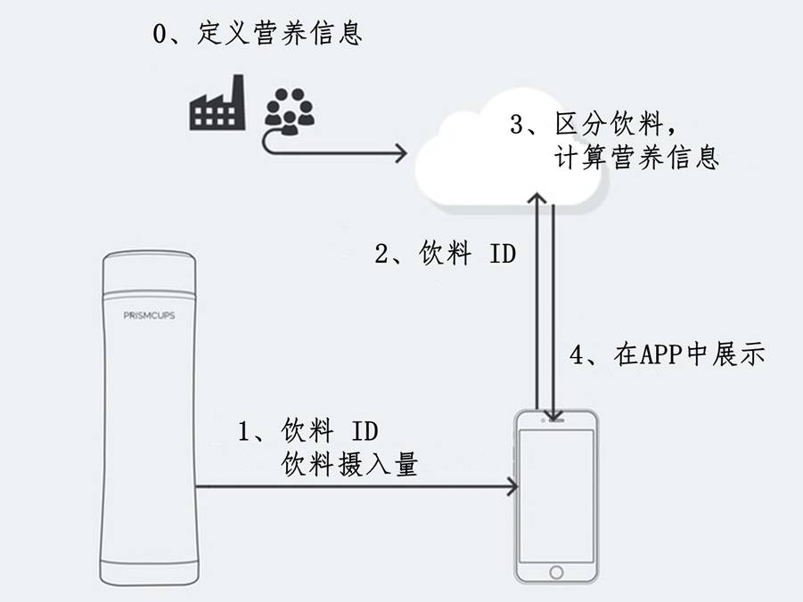 杯子可以收集饮料的 ID,并发送到服务器。它能从预先设定的饮料营养信息中计算营养的数量,然后展示在 APP 上。