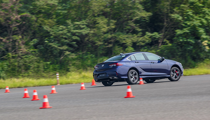 写了这么多,底盘表现还是要靠实操来检验,广德试车场就是君威GS展现实力的秀场,别克专门为君威GS用桩桶摆出了一条弯道多且急的“赛道”。既然是高性能车型,用NORMAL和TOUR模式跑车自己也会不开心的,所以上车第一件事就是轻按挡把前方的模式切换按钮,调至SPORT模式来挑战。在SPORT模式下,君威GS的油门响应度最快,且变速箱会延迟换挡时机来充分释放扭矩。底盘对急弯时车身的侧倾抑制相当到位,抹过弯角的时机恰到好处且干脆利落,车尾不会有丝毫的拖拽感,整辆车如磁铁般被紧紧吸附于地面之上,虽无四驱系统加持,但也不会出现侧滑,试图显出的调皮被骨子里的稳重一扫而空。