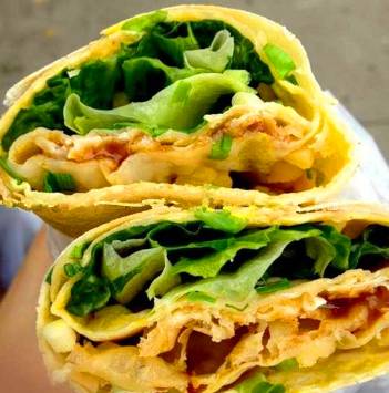 开在纽约的“老金煎饼”就是师承煎饼果子,由在国外留学却沉溺于煎饼无法自拔的老金创立,并根据美国人的口味,用甜咸辣的海鲜酱代替腐乳、用炸馄饨皮代替油条、还添加了老干妈!!同样因为美国人爱吃肉,所以也为客人提供了多种肉类的选择。