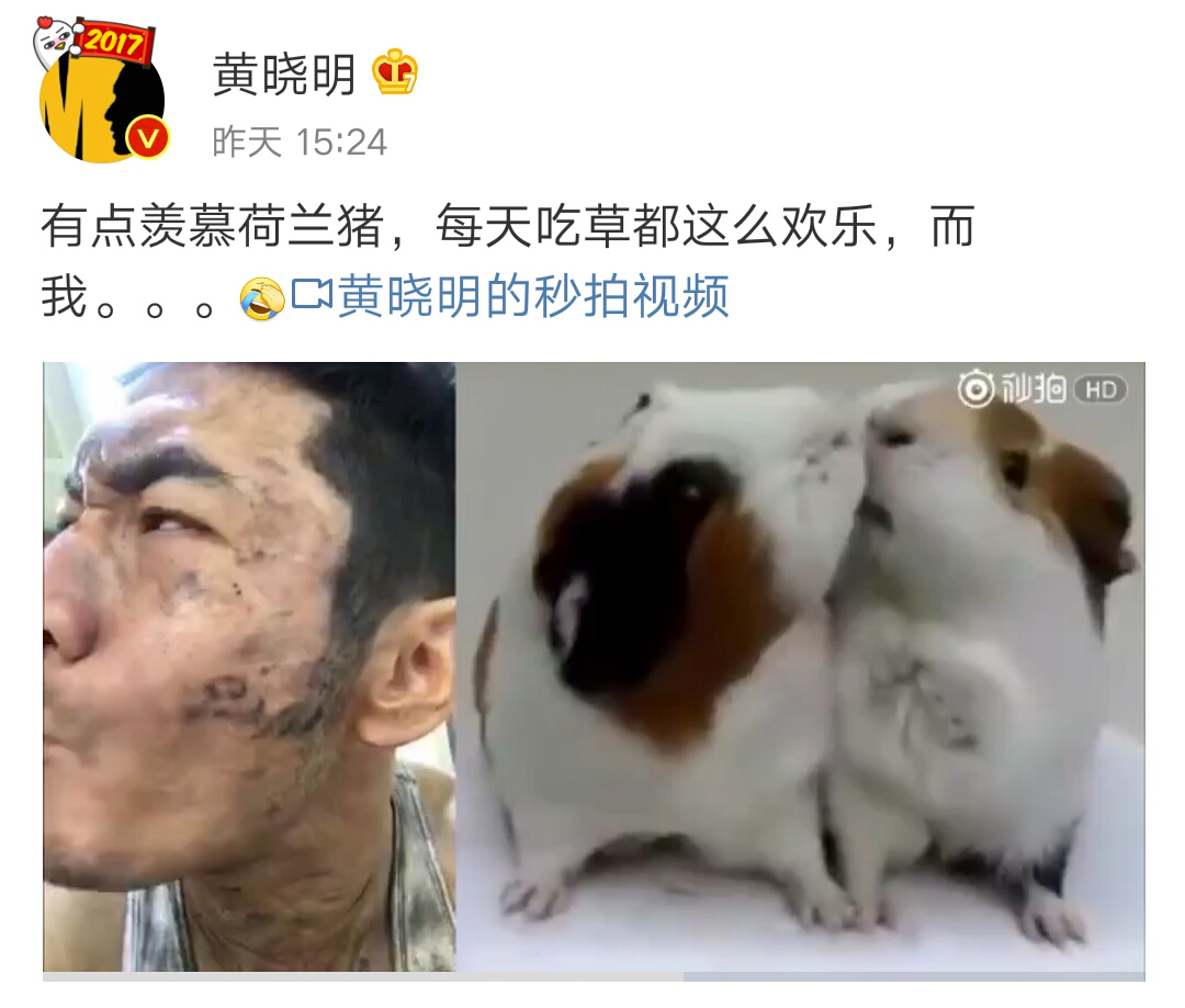 日前,黄晓明模仿荷兰猪,网友直呼男神包袱碎一地!黄晓明:“有点羡慕荷兰猪,每天吃草都这么欢乐,而我。。。”看到这个神模仿,被angelababy看到黄晓明要跪搓衣板吧?