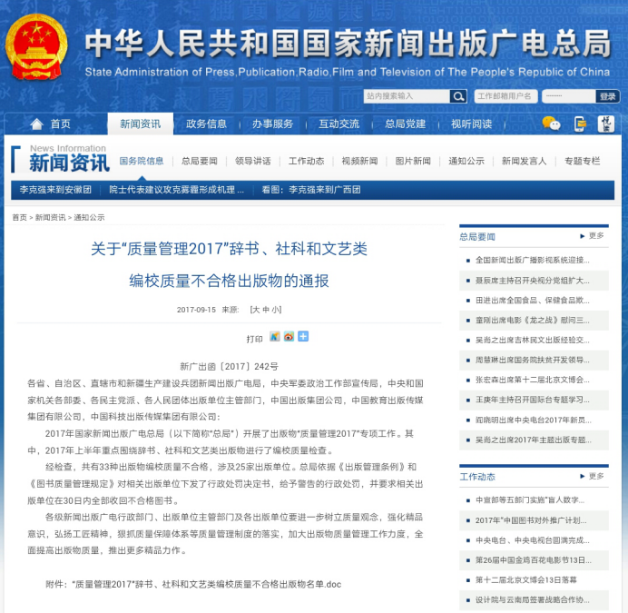 9月15日讯,2017年国家新闻出版广电总局开展了出版物“质量管理2017”专项工作。其中,2017年上半年重点围绕辞书、社科和文艺类出版物进行了编校质量检查。经检查,共有33种出版物编校质量不合格,涉及25家出版单位。