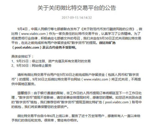 9月15日讯,微比特交易平台称决定在9月30日正式关闭该平台。这是继比特币中国之后,第二家宣布关闭的虚拟货币交易平台。
