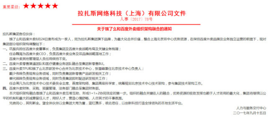 饿了么:9月15日讯,饿了么发布内部邮件,宣布了与百度外卖整合的最新进展:原百度外卖CEO巩振兵调任为百度外卖董事长,负责集团及百度外卖战略布局及关键业务梳理。而百度外卖的实际业务运作,将由新任命的CEO魏海负责,其同时将负责百度外卖业务及双品牌战略落地工作;百度外卖其他管理层人员任用保持不变。