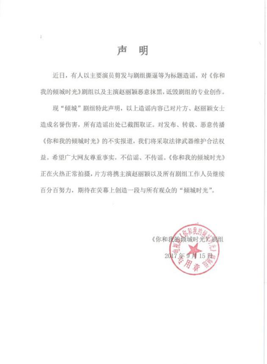 电视:9月15日讯,“倾城”剧组针对有人以主要演员剪发与剧组撕逼等为标题造谣,对《你和我的倾城时光》剧组以及主演赵丽颖恶意抹黑,诋毁剧组的专业创作,现特此声明,以上造谣内容已对片方、赵丽颖女士造成名誉伤害,所有造谣出处已截图取证。