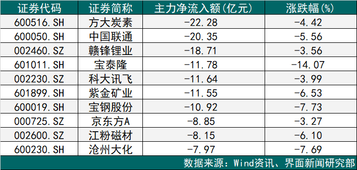 本周主力资金持续净流出的个股中,共计146只个股的累计净流出额超1亿元。其中,方大炭素(600516.SH)、中国联通(600050.SH)、赣锋锂业(002460.SZ)、宝泰隆(601011.SH)、科大讯飞(002230.SZ)、紫金矿业(601899.SH)、宝钢股份(600019.SH)等7只个股的累计净流出额超过10亿元。