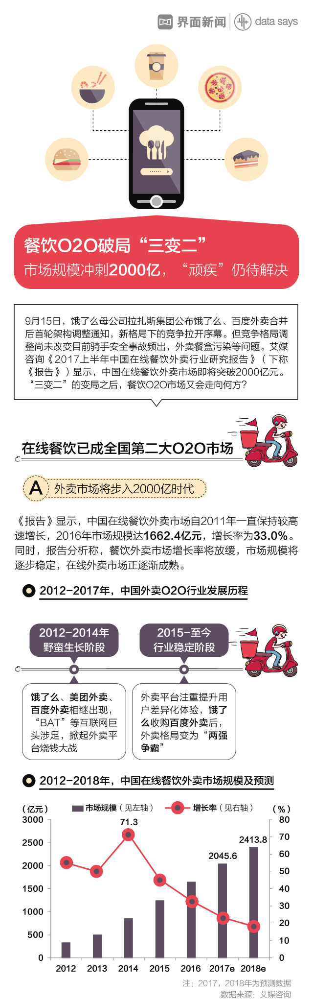 餐饮O2O市场规模冲刺2000亿,竞争格局“三变二”但行业顽疾尚未改善。