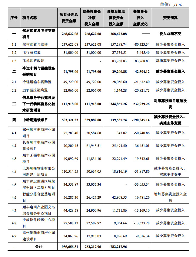 截止2017年7月18日,顺丰在“航材购置及飞行支持项目”已投入7.3亿元,因“航材购置与维修”、“飞行员招募”子项目投入进度未及预期,拟减少投入,并新增新增“飞机购置改装”子项目,包括采购波音757和波音767,原因是现有飞机运力已不能满足业务发展的需要。