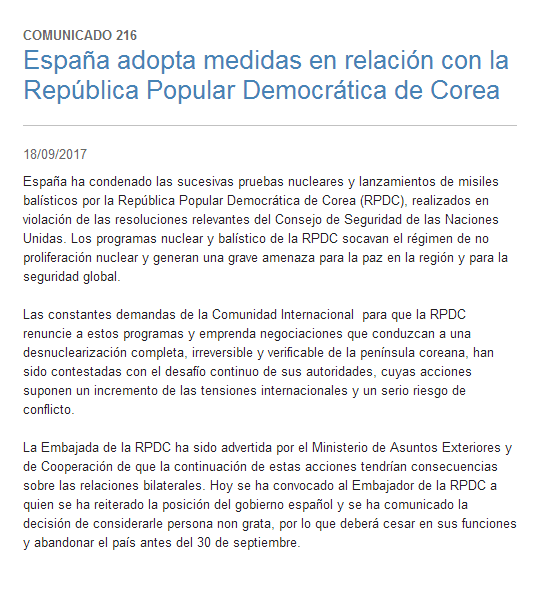 西班牙外交部在一份声明中表示:“今日,朝鲜大使被召见,并被告知他被西班牙认定为‘不受欢迎的人’。因此,他必须停止工作,并于9月30日之前离境。”
