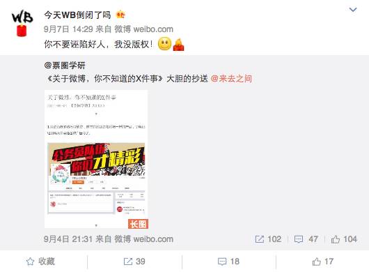 16年5月17日,有人注册了ID叫“今天WB倒闭了吗”的微博账号,日更是不遗余力地点蜡烛黑新浪和微博,截止9月18日这个账号已经更新了1739条。