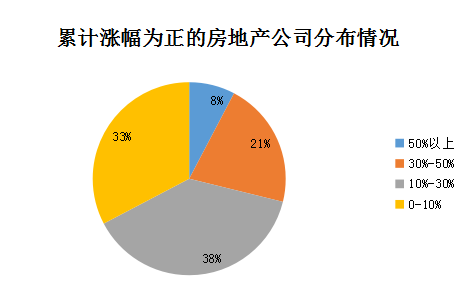 具体到A股上市公司来看,申万行业房地产类119家公司(排除园区开发类公司)今年以来有52家累计涨幅为正,64家为负,还有3家为0%;累计涨幅为正的公司中,涨幅超过50%的有4家,介于30%至50%的有11家,介于10%至30%的有20家,还有17家公司的涨幅大于0但低于10%。