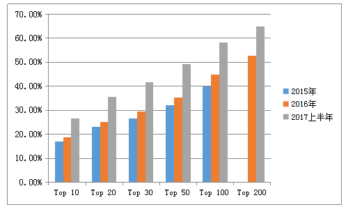 值得投资者注意的是,在金融去杠杆的大背景下,大型上市房企除了通过股票市场进行融资之外,其自身隐含的信用也便于发行公司债券,尤其是港股内房股还能够通过发行美元债来融资;相比之下,未来中小房企的融资渠道将会越来越窄,拿地能力也会相应越来越差,失去了“面粉”自然无法做出“面包”,大房企对中小房企的收购兼并将成为常态,行业集中度提升也将成为必然。克尔瑞研究数据表明,2015年至2017年上半年,各梯队房企销售金额集中度均呈明显上升趋势,其中Top 20房企的销售金额占中国房地产市场的比例由2015年的23.10%提高到35.60%。