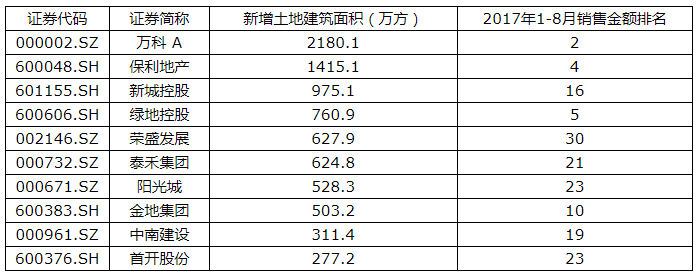 从已经披露的今年1-7月新增土地的建筑面积情况来看,A股上市房企中万科A以及保利地产(600048.SH)以超过1400万方遥遥领先表格中其他8家企业,而新城控股(601155.SH)则以接近1000万方位居第三位。