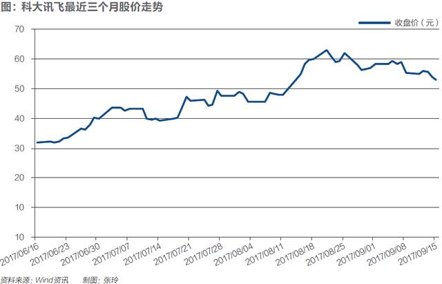 8月28日,科大讯飞股价冲高跳水,跌幅达6%。两日内市值蒸发近80亿元。几天之后,资本市场又掉头追涨,9月1日起,连续三日冲高。截至9月15日收盘,股价53.00元,市值约为736亿元。