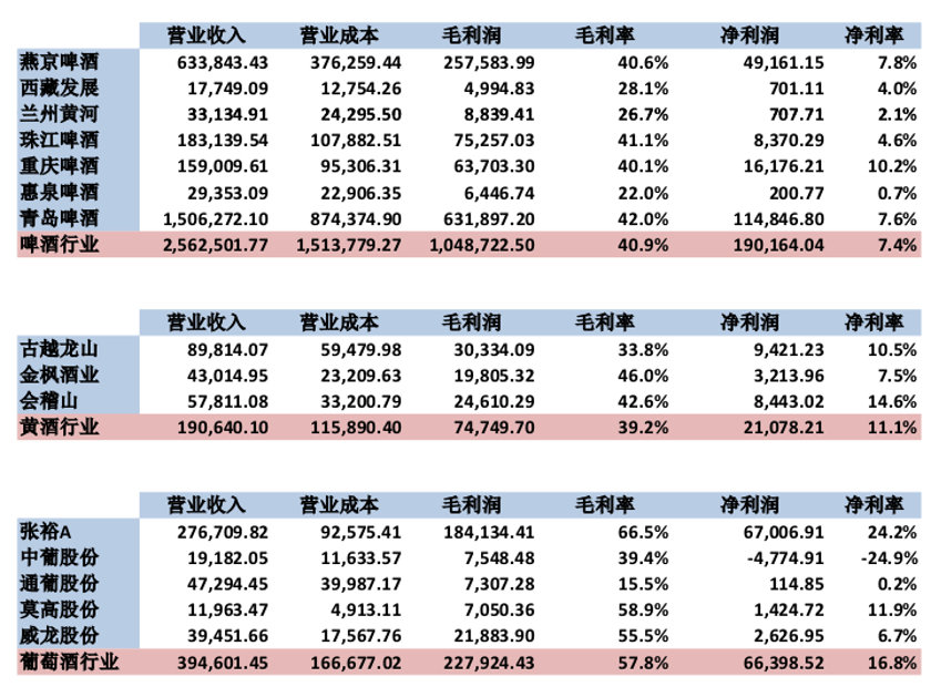 根据界面新闻的统计,啤酒行业上市公司的整体毛利率水平为40.9%,净利率仅为7.4%;黄酒行业整体毛利率为39.2%,净利率为11.1%。葡萄酒行业盈利能力略强,但整体毛利率仍只有57.8%,净利率为16.8%。