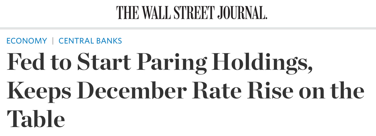 【美联储下个月开始“缩表” 12月前或再加息】美联储周三发表讲话说,将于10月开始缩减资产负债表的计划,以减少其自2008年金融危机后购入的大量债务,同时也有可能在12月之前再次调高短期利率。