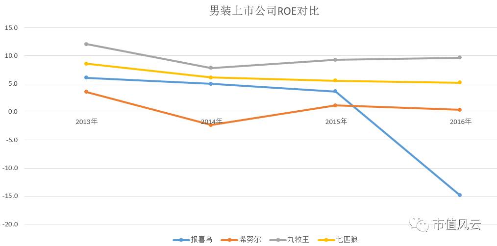 常看风云君文章的读者都知道ROE(净资产收益率)反映了公司运用自有资本的效率。数据表明,同九牧王和七匹狼相比,报喜鸟还有不小的差距。尤其是2016年这一哆嗦,让一直倒数第一的希努尔上升了一个名次。。。