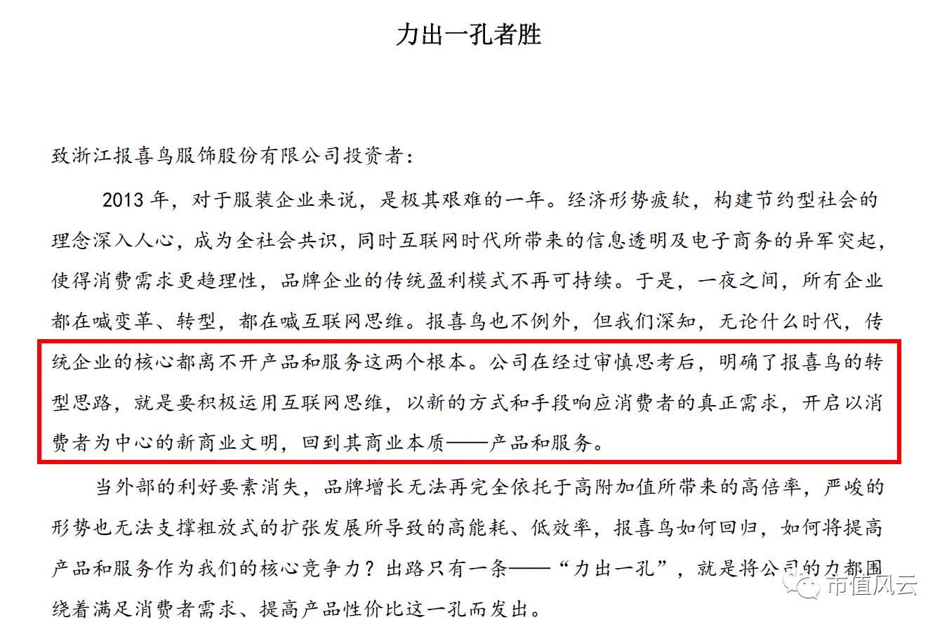 2013年报喜鸟的年报中破天荒地出现了一封致投资者的信,信中提到“要积极利用互联网思维,以新的方式和手段响应消费者的真正需求……”