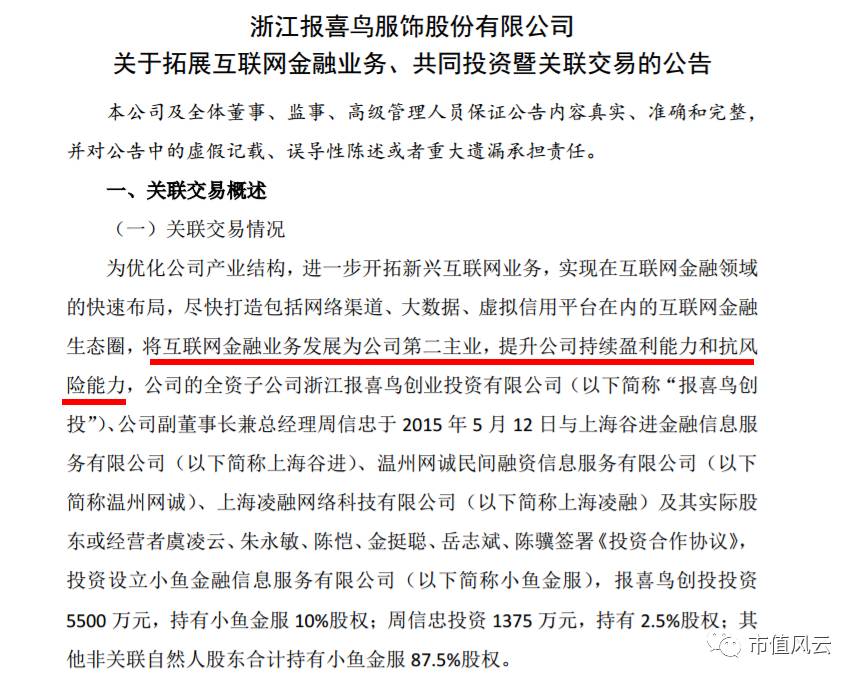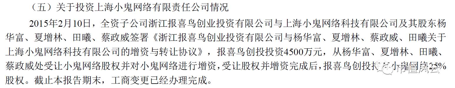 年报中透露,公司全资子公司报喜鸟创业投资公司有限公司投资4500万元,受让小鬼网络股权并进行增资,持有小鬼网络25%股权。所以,终于还是对互联网下手了。