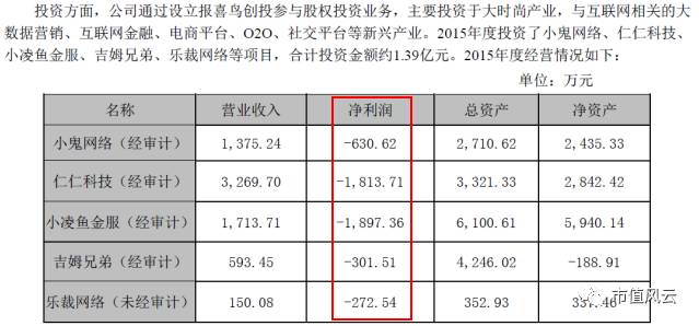 2015年除小鬼网络之外,陆续投资1.39亿元,参投仁仁科技(3月增资,主营移动互联网O2O及大数据营销)、小凌鱼金服(5月增资,主营互联网金融)、吉姆兄弟(6月增资,主营时装定制、跨境电商)、乐裁网络(7月增资,主营O2O、服装定制)等项目。