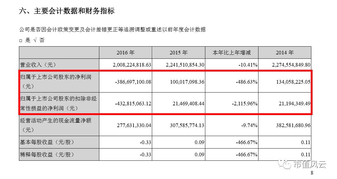2016年净利润下滑至-3.87亿元,同比下滑-486.63%,是上市以来首次亏损。