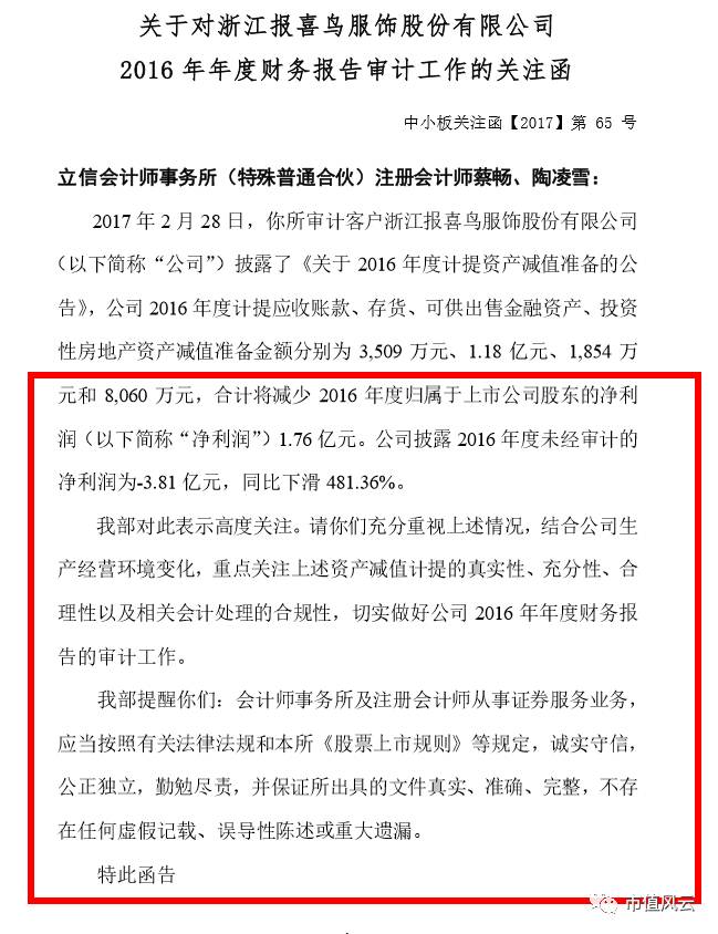 2017年2月28日,深交所向报喜鸟审计单位(立信会计师事务所)下发了关注函。