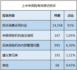 从投诉内容上看,包括投诉消费合同纠纷、举报保险机构违法违规、反映保险机构内部管理问题、建议意见类和其他。