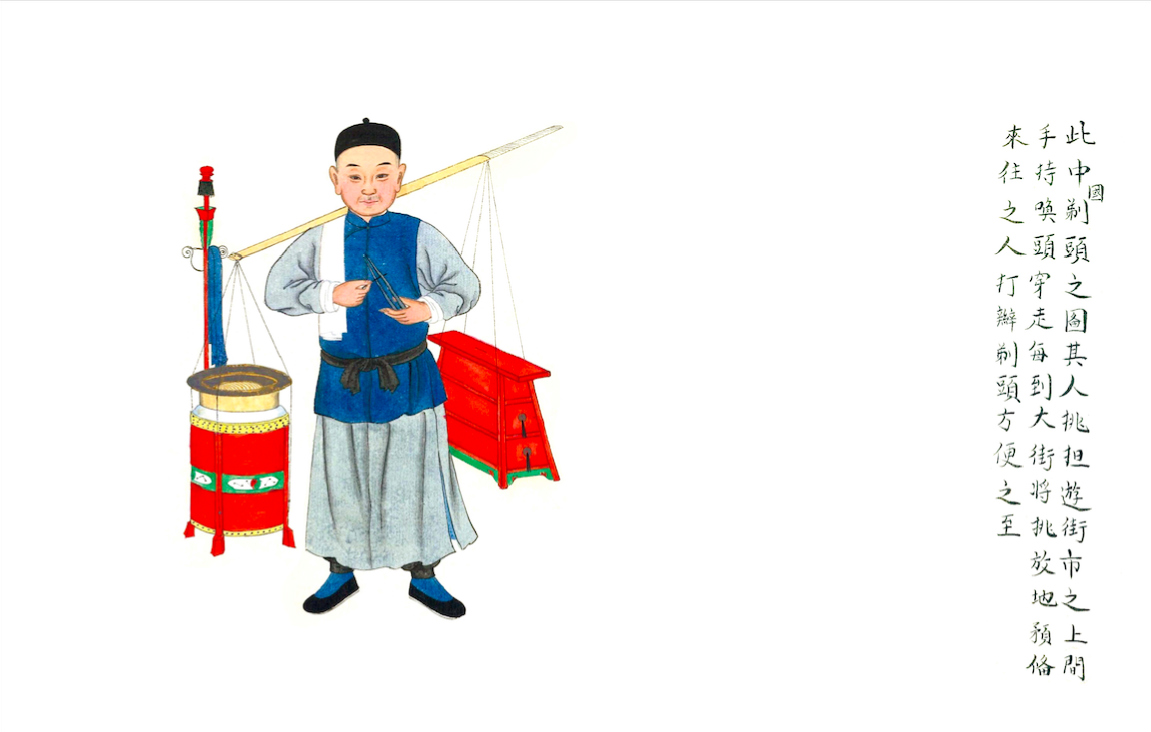 其人挑担游于街市之间,手执“唤头”,串走胡同,每到大街,将担放地,等来往之人刮脸、打辫子、剃头,方便之至。