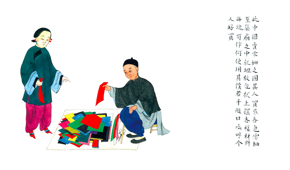 其人在各处买来各色零绸,至集庙之中,就地铺包袱上摆各色材料,每块可做何使用,其价若干,随口便讲,令人好买。