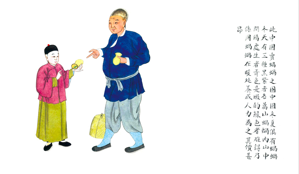 中国冬夏俱有蜗蝈。冬有三种:黑紫色者名为山蜗蝈,乃山中向阳处生者;青色是嫩的;绿色者难得,乃系用蜗蝈子在暖处养成,人力为之,其价甚昂也。