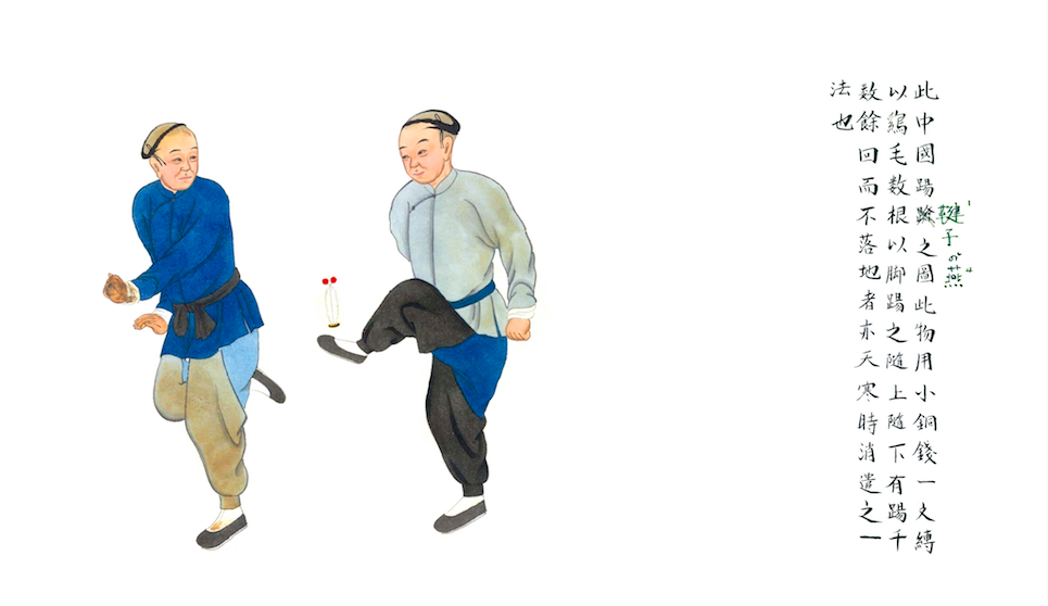 此物用小铜钱一个,缚毛一根(或一撮),以脚蹄之,遂上遂下,有蹄千余回而不落地者,亦天寒时消遣之一法也。