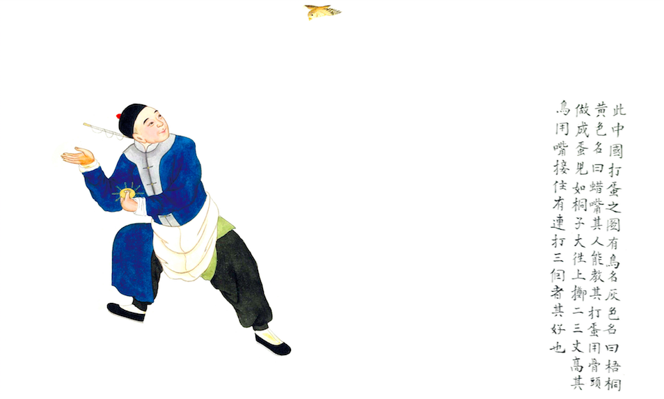 有诸鸟名:灰色是“梧桐”,黄色是“蜡嘴”,又名“蜡嘴粉红”,能教打蛋,用骨做成如往上掷二三丈高,其鸟用嘴接住,有连打三个者,甚妙也。