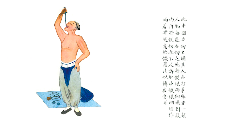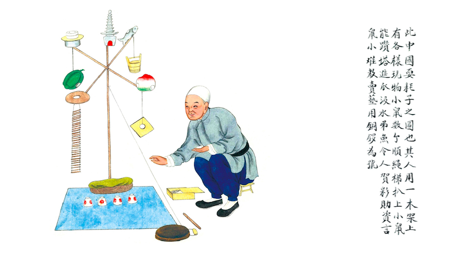 其人用一木架,上有各样玩物,小鼠数个顺绳梏爬上,有小鼠能钻塔、进瓜、汲水、钓鱼,令人喝彩助资,言“鼠小难教”,卖艺用铜锣为号。
