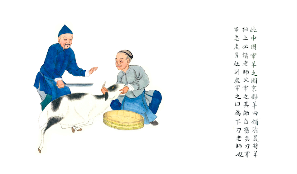 京都羊肉铺中,清晨将羊捆上,必请老师傅宰之。其师自携尖刀,宰毕急走,另赶别处宰之,名曰下刀儿师傅也。