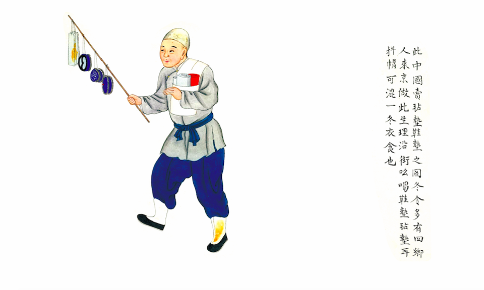 冬令多有四乡人来京做此生业,沿街吆呼:“鞋垫”!“毡垫”!“耳朵帽”!可混一冬衣食也。