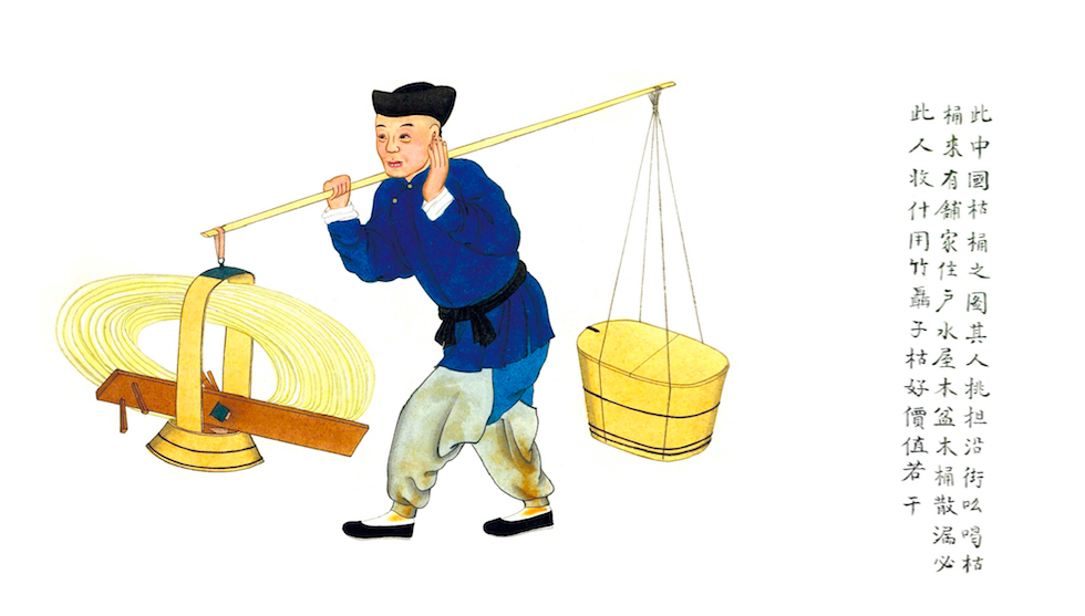 其人挑担沿街吆呼:“箍桶来!”有铺家,住户水屋木盆木桶散漏,必叫此人收拾,用竹蔑子箍好,价值若干也。