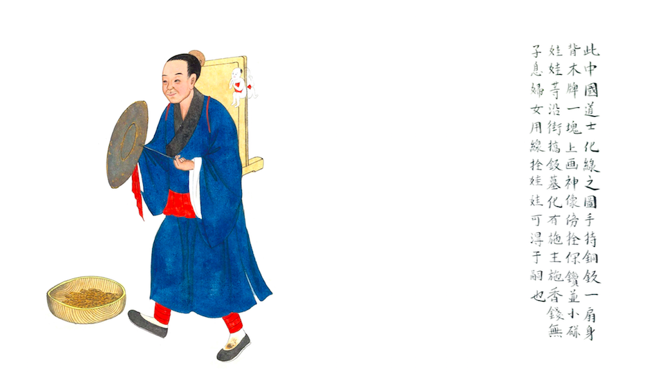 手插铜钹一扇,身背木牌一块,上画神像,旁拴练锁并小磁娃娃等,沿街敲钹募化。有施主舍香钱,无子息妇女用线拴其娃娃,可得子嗣也。