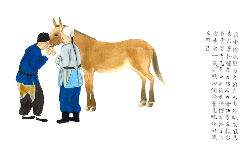 其人由外贩骡马来京师,卖于骡店里。该店主再会主投客卖。买者先看口齿,后看快慢。有俗言几句:“远看一张皮,近瞧四张蹄;来买先'晃眼’,回头再'瞧屈’”也。