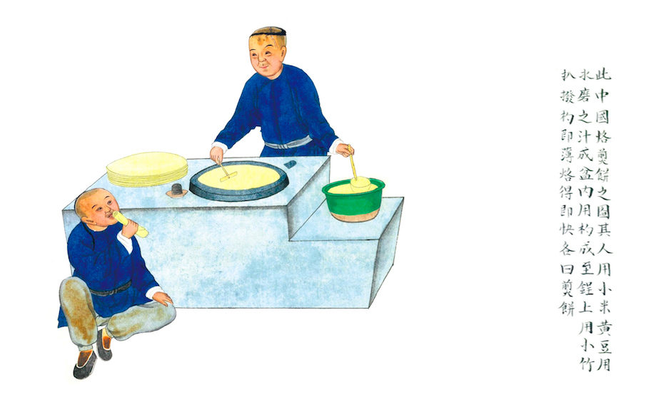 其人用小米、黄豆加水磨成汁,放于盆内,用勺盛至铛上,用小竹耙拨的即薄,烙法即快,名曰煎饼。
