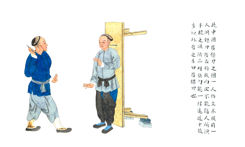 一人站立木板前,一人用镖刀剟去,将挨肉皮,不能伤人。所演手眼之准法,二人对换,均能一律远近,一样数步以外剟镖,名曰剟镖刀也。