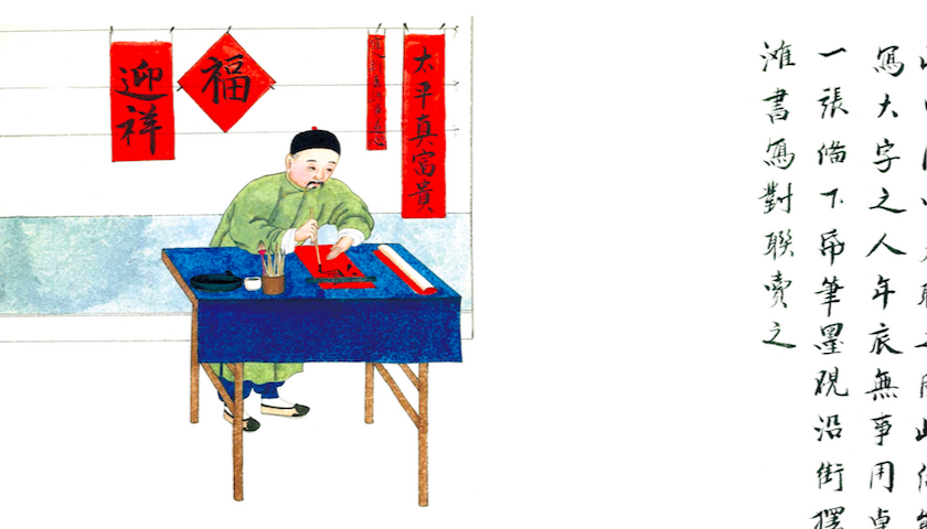 此系能写大字之人,年底无事,用桌一张,备下纸笔墨砚,沿街摆摊,书写对联卖之。