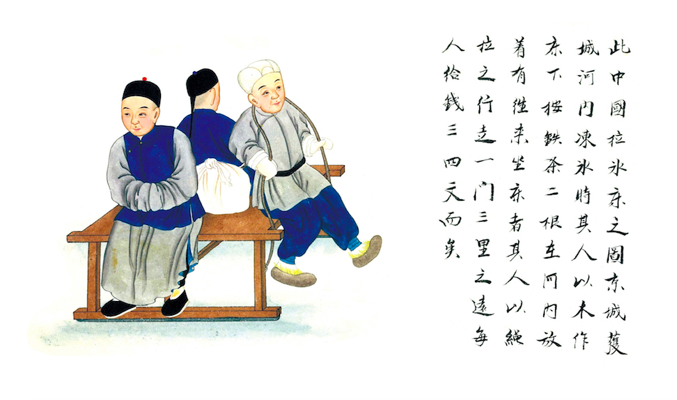 京都城根护城河,冬天冰冻时,其人用木做成床,下安铁条二根,在河内放,有来往人坐之,其人用绳拉之,行走一门三里之遥,每人给钱三百文。
