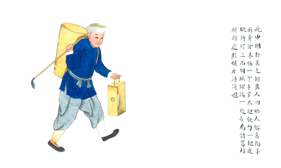 其人四乡之人,俗名掏茅厕的,身背木桶一个,手拿木把铁勺一把,夜晚持灯,其灯三面糊纸,一面玻璃一块,名为诸葛灯,所为暗处照明看得清也。