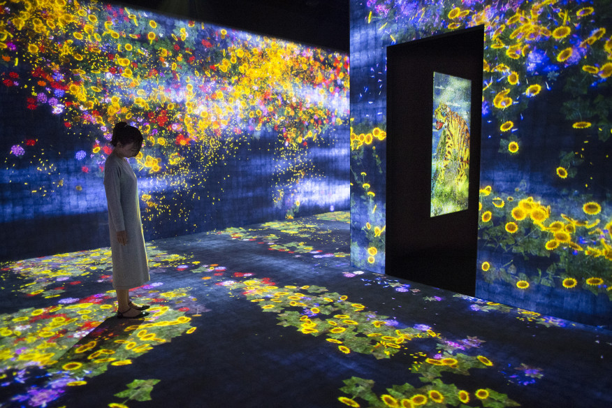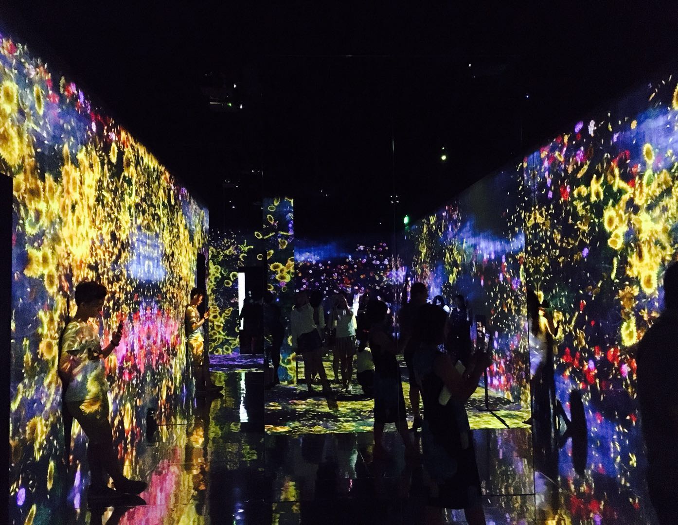展览中最受欢迎的作品“Flower Forest, Lost and Immersed”,在全黑的镜面空间内呈现出了一整片虚拟花海。向日葵、樱花、牡丹等花卉会伴随人的移动盛开、聚拢又凋谢。不少来看展的年轻人都是一番精心打扮,在人潮涌动的花海中找到空位、摆好造型,然后完成一张惊艳朋友圈的照片。