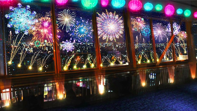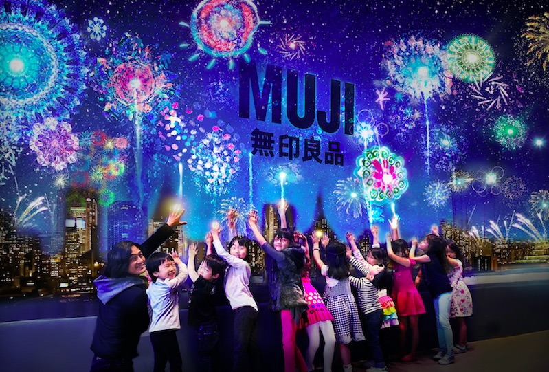 日本另一个数字艺术团队NAKED则为日本不少一些商场、水族馆定制了“不会燃烧的烟花”,将仅存在于户外的花火大会带进了商业设施内,这些电子花火大会在全日本累积动员了超过120万观众。无印良品在纽约的门店也曾与他们合作,把孩子们手绘的烟花转换到了大屏幕上变成了用手拍就会绽开的花火。