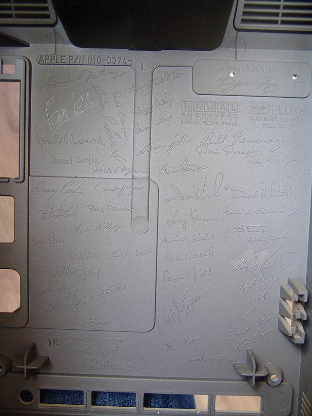 受此影响,1982 年 2 月 10 日,乔布斯要求所有 47 名 Macintosh 团队成员在一张纸上签下自己的名字,这些名字最终被镌刻在了一台 Macintosh 机箱的内侧。当时在上面签名的工程师 Andy Hertzfeld 后来回忆,“这是一个自然而然的过程,真正的工匠应该对自己的作品签名。”