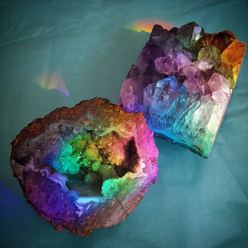 水晶是天然形成的,但是七彩颜色是通过金属镀层这一流程得来的...